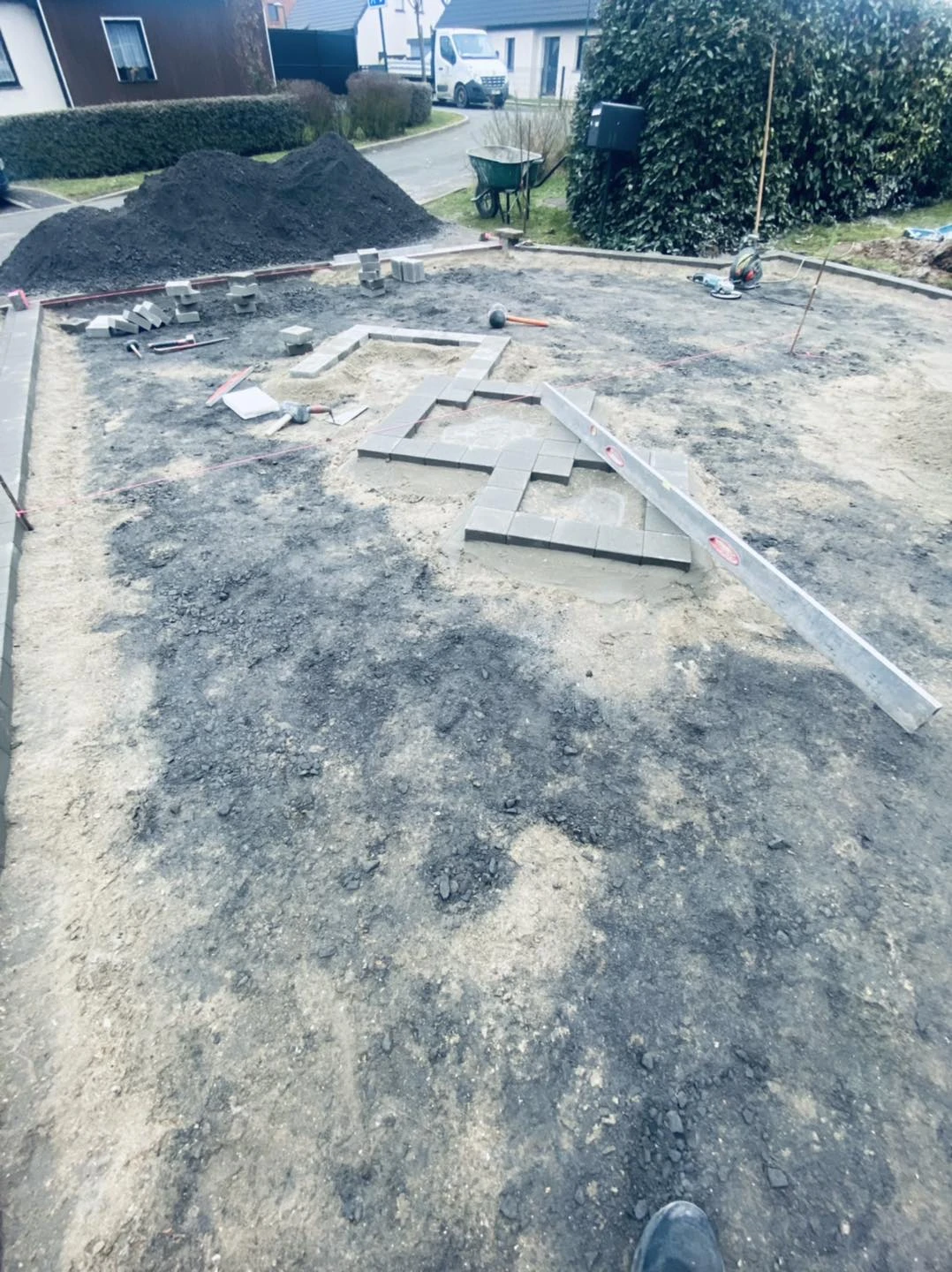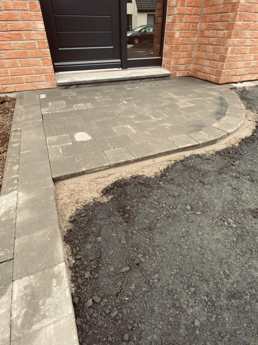Notre client nous ont fait confiance dans la réalisation d'une devanture en enrobé avec une frise en pavé béton et motif au sol .