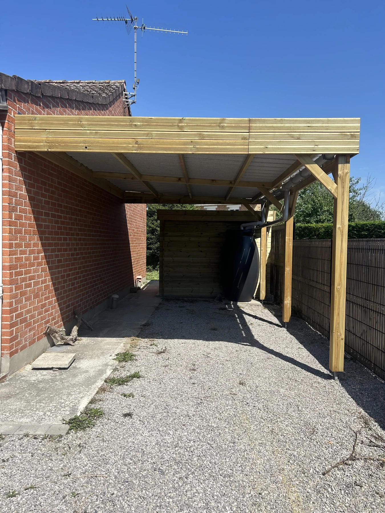 Notre client nous a fait confiance afin d'effectuer la fourniture et la pose d'un carport et d'un abri de jardin à son domicile Nous avons effectué la réalisation des plots béton, la création du carport sur mesure et son montage ainsi que la pose des tôles en bac acier. De plus, nous avons effectuer la pose de l'abri de jardin.